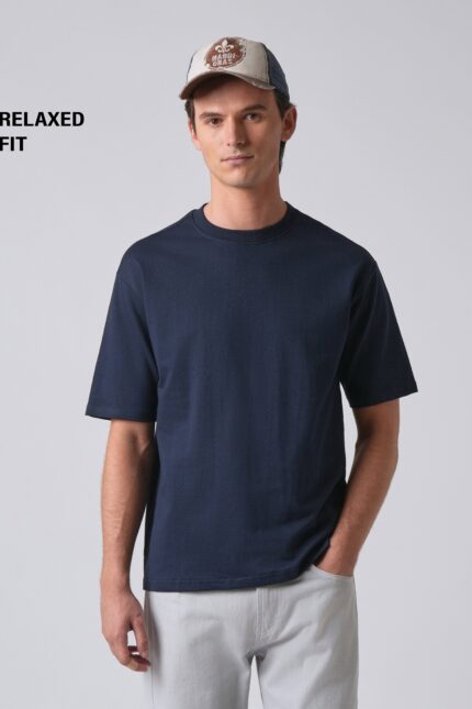 Navy Blue Basic Relaxed Fit Cotton T Shirt