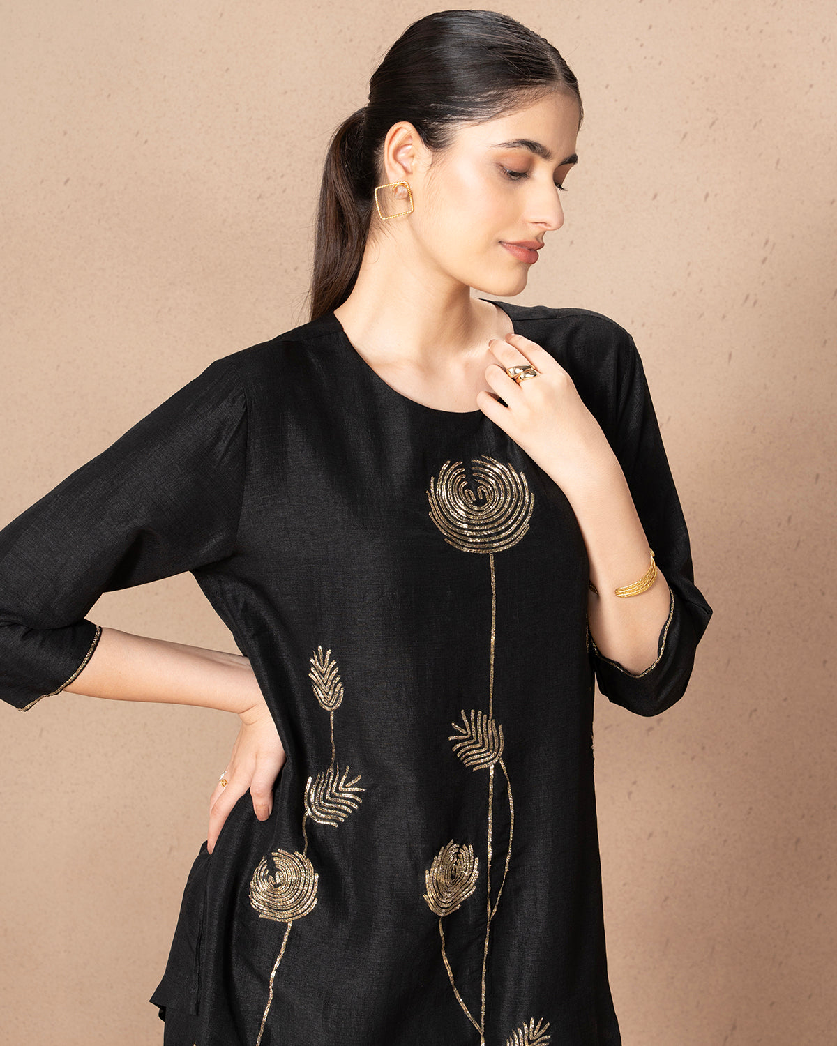 Elevate your style with this elegant black Russian silk top, featuring a slimming V-cut and intricate dabka pita work.