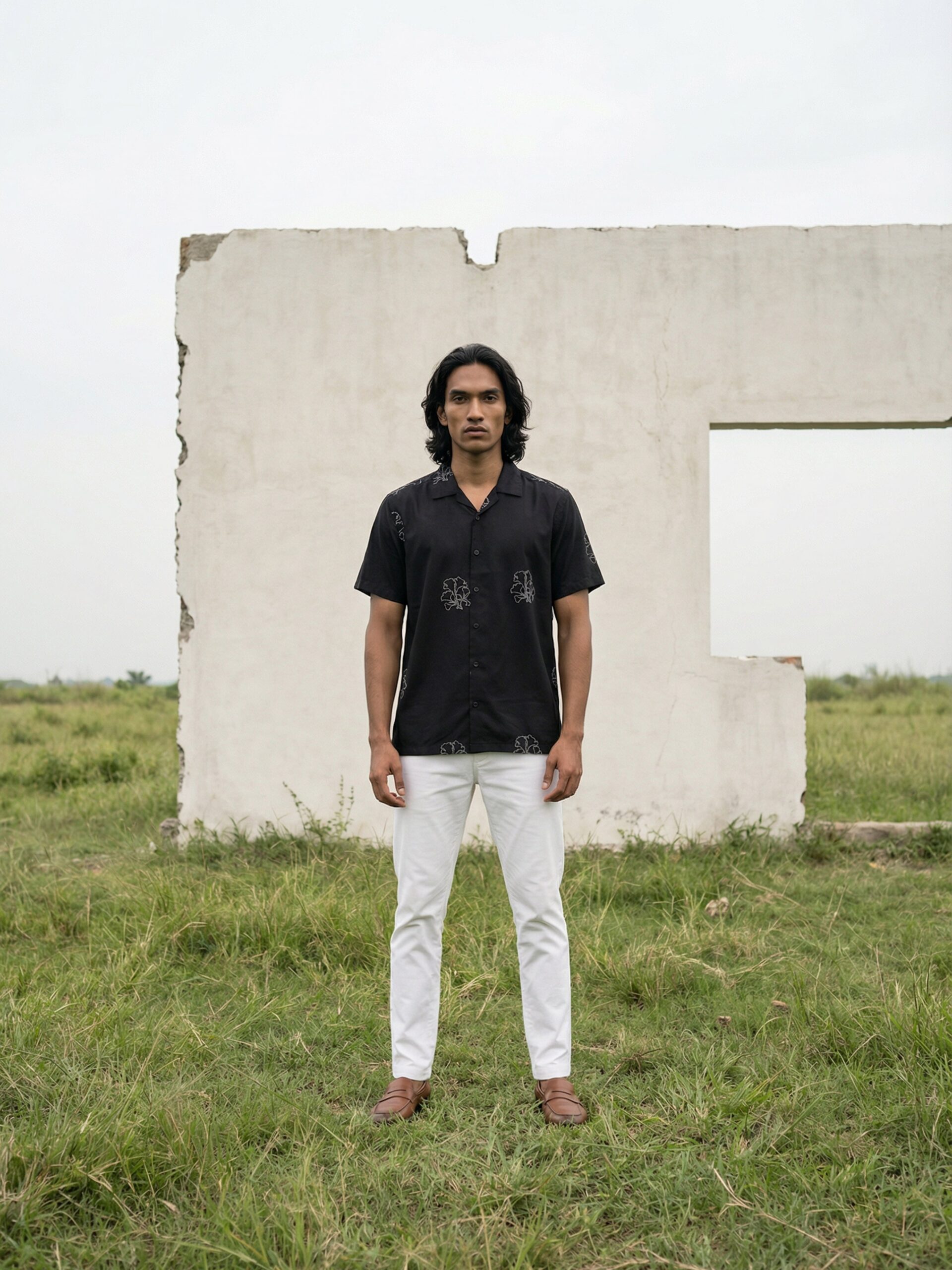 Black Embroidery Fabric Qafeer Cuban Collar Shirt