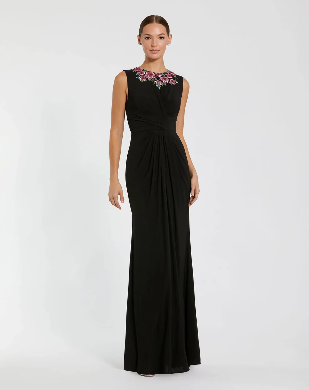 Black Jersey Twist Party Gown with Embellished Neckline