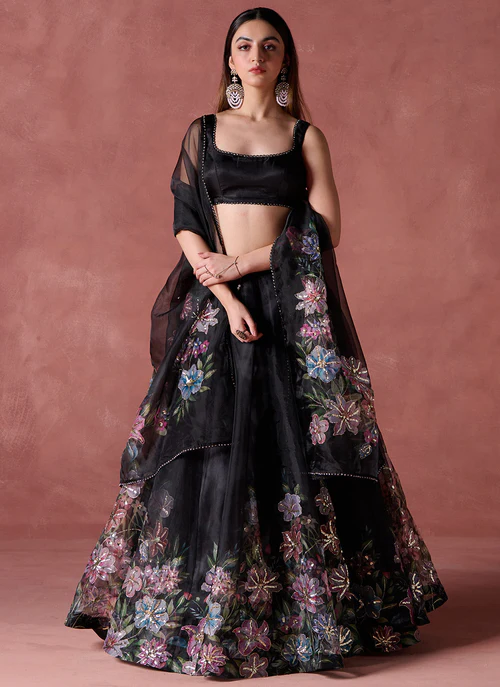 Graceful Black Organza Lehenga with Colorful Floral Print