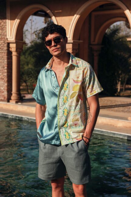 Make a sophisticated summer statement in our Coral Block Small Lemon Shirt featuring exclusive artwork. This tri-tone design combines sleek poly satin with ultra-breathable cotton mulmul for exceptional comfort during beach vacations and outdoor events.