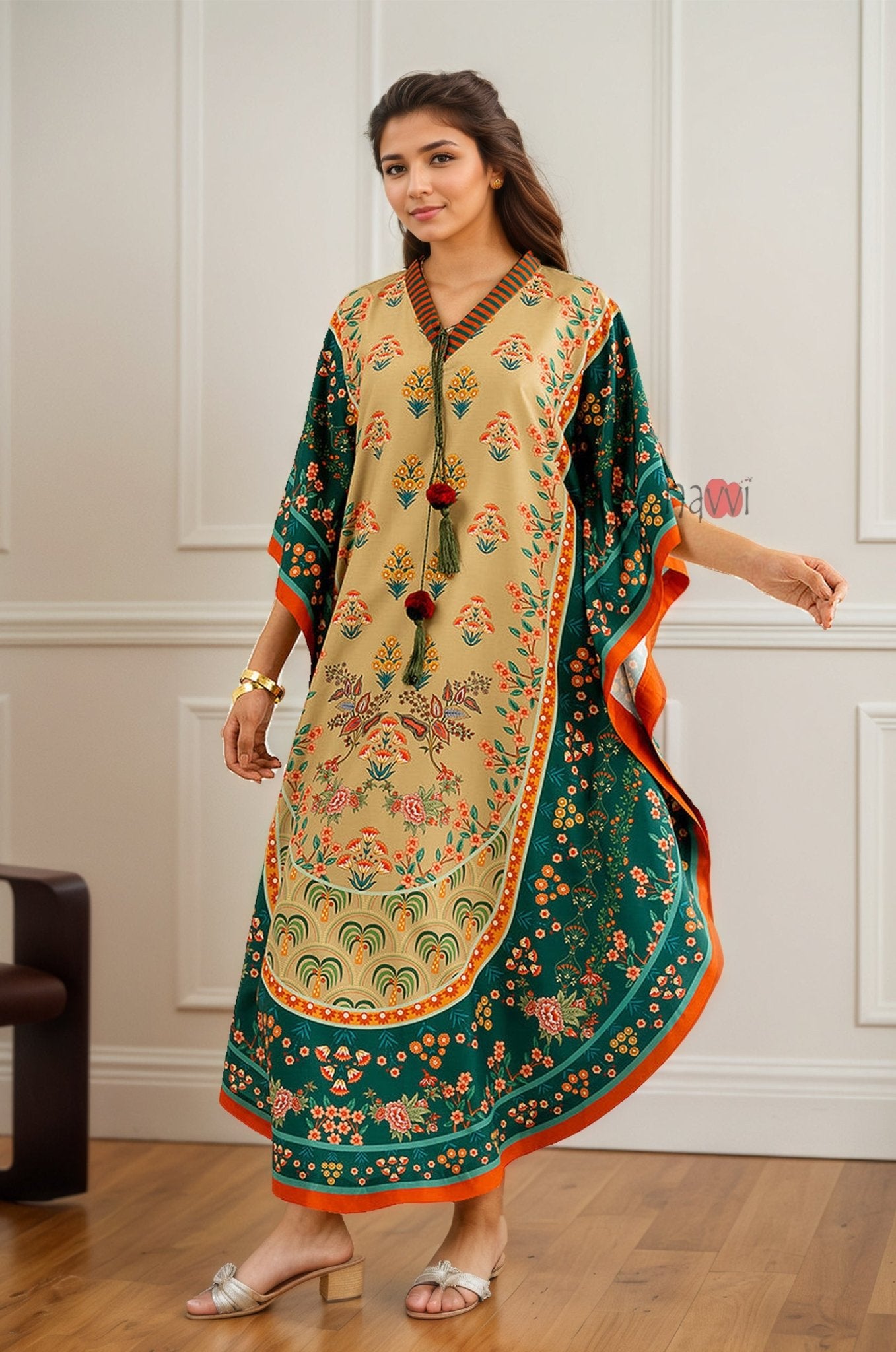 Emerald Beige Tassel Kaftan Dress Elegant Style ? Elegant emerald and beige kaftan dress detailed with stylish tassels, offering a sophisticated blend of color contrast and graceful drape suitable for festive gatherings and evening wear.
