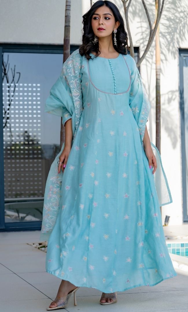 This soft pastel blue Anarkali suit features delicate floral embroidery, a modest round neckline, and fabric buttons at the front. The matching Kota Doria dupatta complements the Anarkali perfectly, making it ideal for festive occasions.