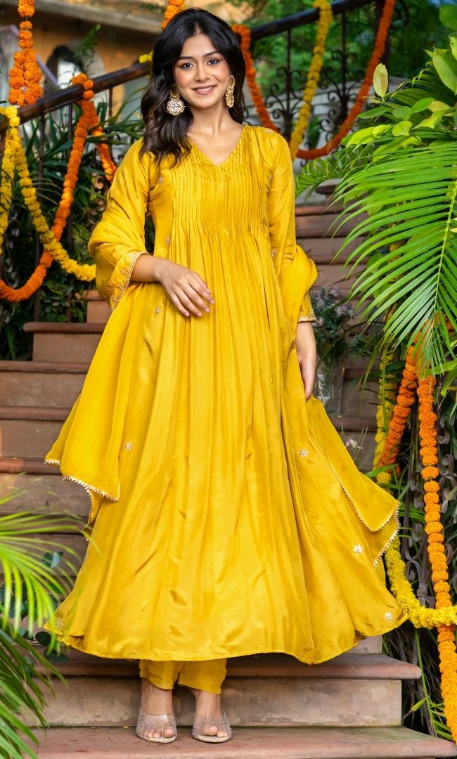 The Anarkali dress features a stunning V-neckline that elegantly frames the face,, it showcases a beautifully flared silhouette that gracefully flows with movement.