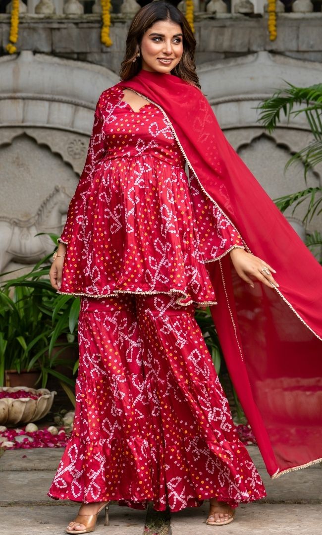 Make a statement in contemporary elegance with our Bandhani Sharara Set, thoughtfully designed for festive celebrations. The ensemble features a gracefully gathered sharara bottom paired with a uniquely styled kurta that flatters every silhouette. A delicate sweetheart neckline, full sleeves, and intricate moti lace embellishments add refined charm. Perfectly blending tradition with modern chic, this set is an ideal choice for weddings, special occasions, and festive gatherings.