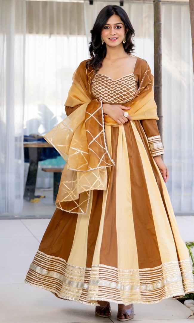 This beautiful brown and beige Anarkali features alternating striped fabric for a sophisticated look. The yoke and hem are adorned with elegant gota work, and the matching dupatta has a brown-to-beige ombre finish with gota lace detailing, perfect for weddings.