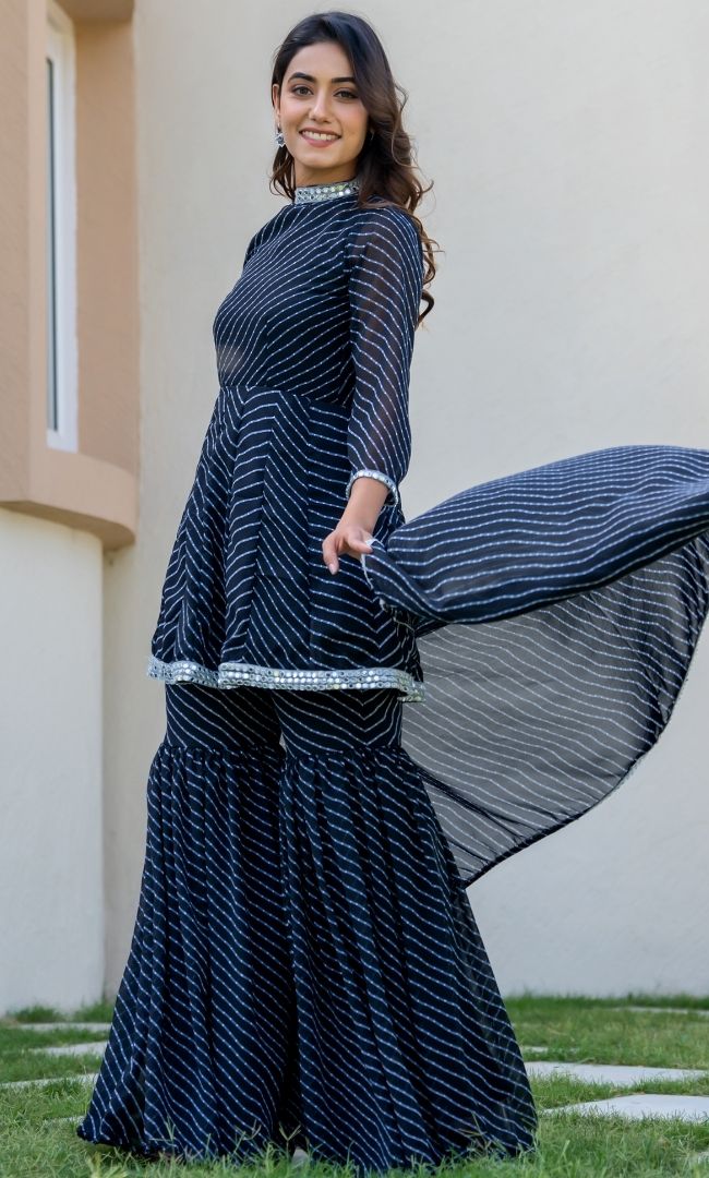 This method print sharara set consists of a mirror work lace on the neck, sleeves and hem of the kurta, as well as the sharara. Not leaving behind the dupatta, in the same fabric, this dupatta as well holds the mirror work lace, making this overall a hit fit for all occasions.