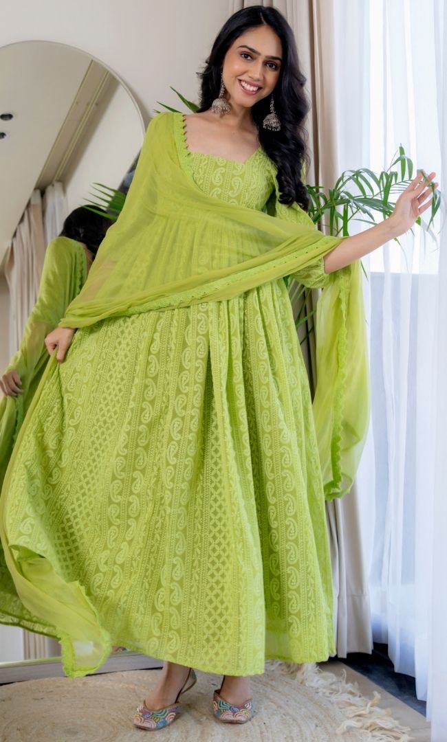 This green georgette Chikankari Anarkali set features delicate chikankari work that enhances the beauty of the fabric, perfect for festive and special occasions.