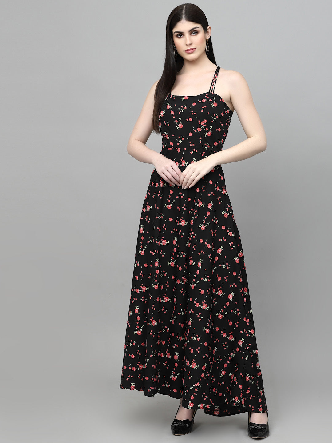 This Floral Qafeer Women Maxi Black & Pink Dress features delicate spaghetti straps and a flattering square neckline. Its voluminous A-line skirt with a vibrant pink floral print is perfect for stylish outdoor events and resort vacations.