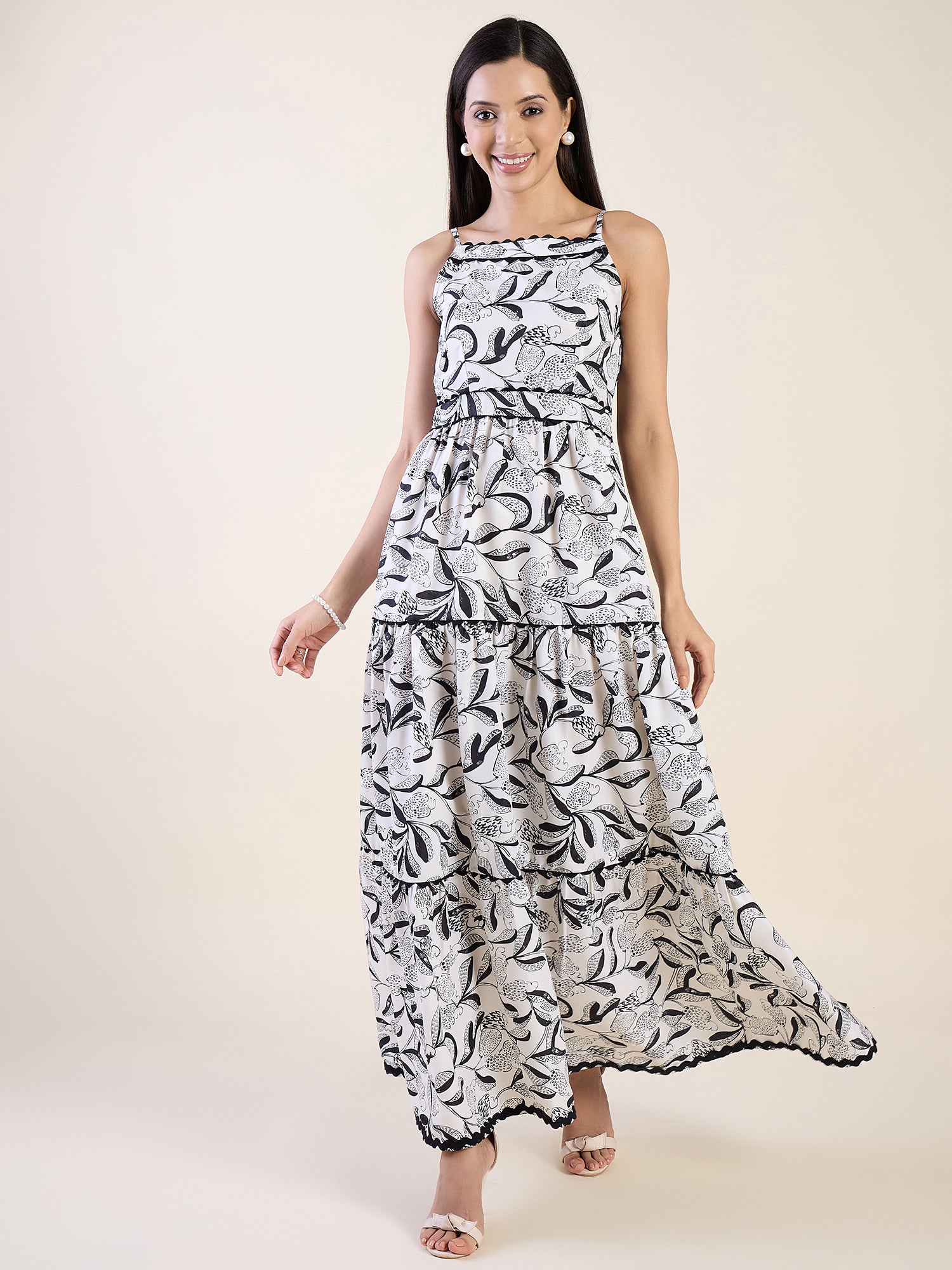 Qafeer Black White Floral Tiered Maxi Dress