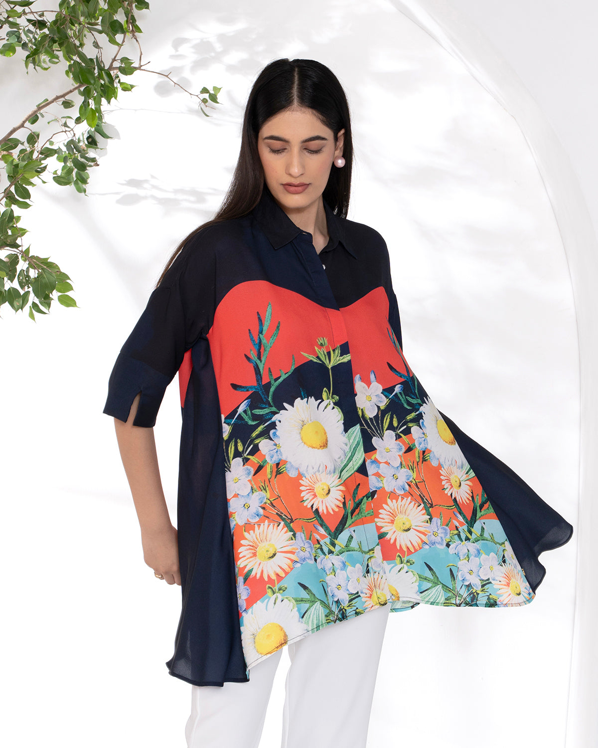 Bold and breezy, this long shirt features a statement floral print blended with striking color blocks for an effortlessly artistic vibe.
