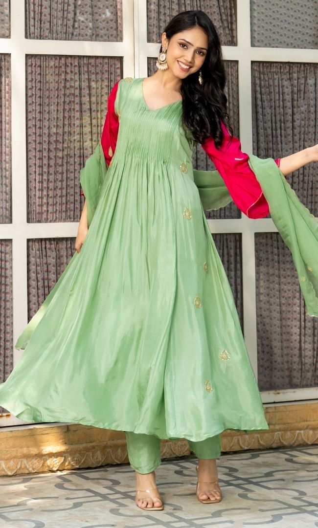 The Anarkali dress features a stunning V-neckline that elegantly frames the face,, it showcases a beautifully flared silhouette that gracefully flows with movement.