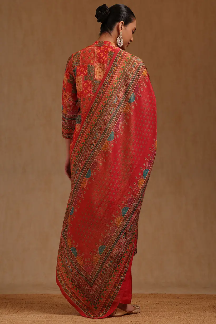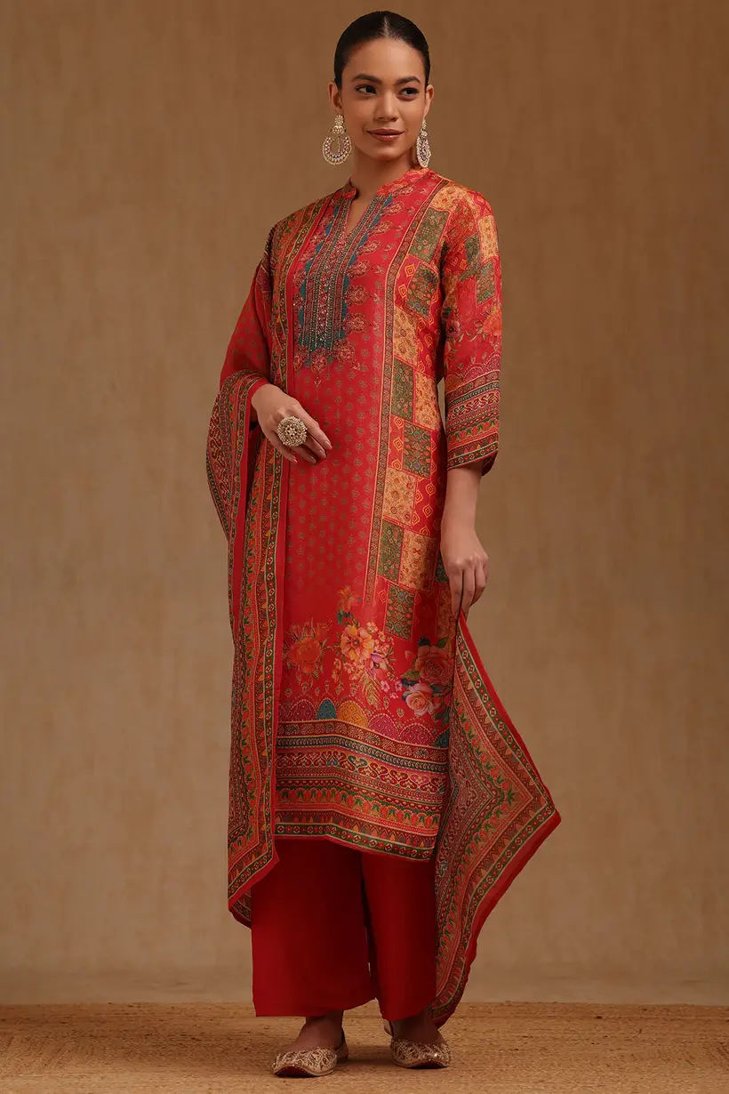 The suit is adorned with elegant ethnic print work that adds a traditional charm while keeping the overall design sophisticated and modern. The intricate prints stand out gracefully against the rich red base, making this ensemble ideal for festive celebrations, family functions, cultural gatherings, and special occasions. The gentle shimmer of the silk fabric elevates the ethnic detailing, creating a striking yet balanced appearance.