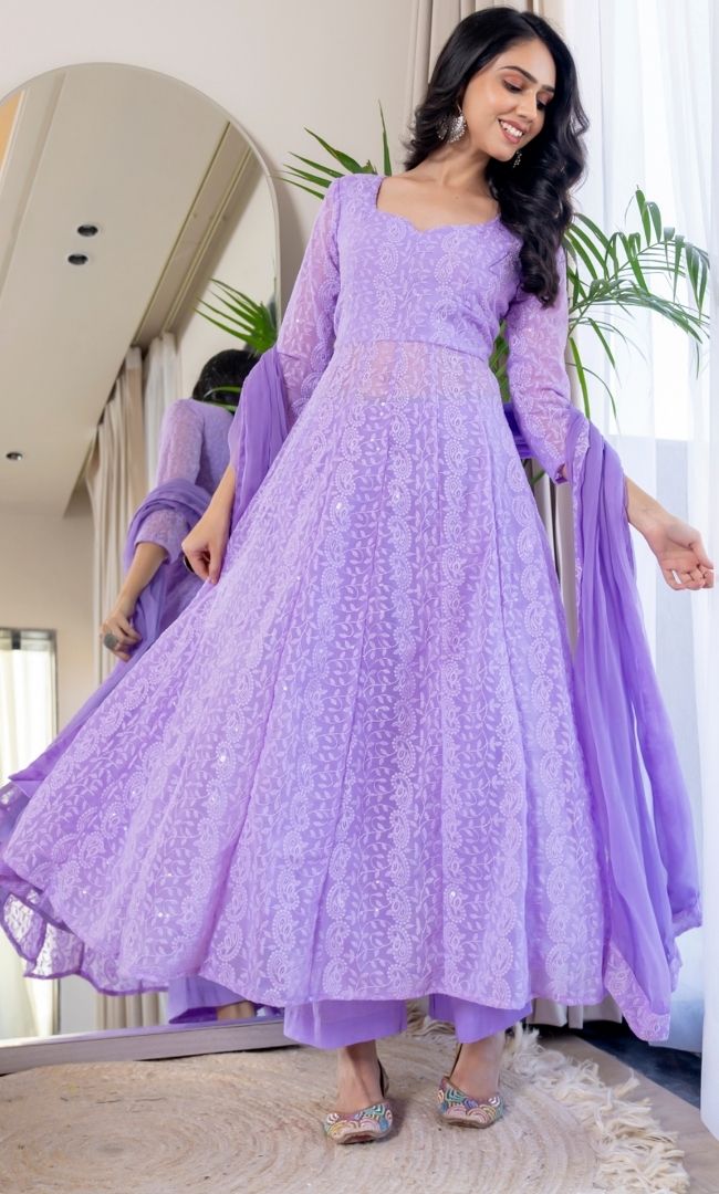Home Suit Set Syra Lavender Chikankari Anarkali Set Traditional Lucknowi Style